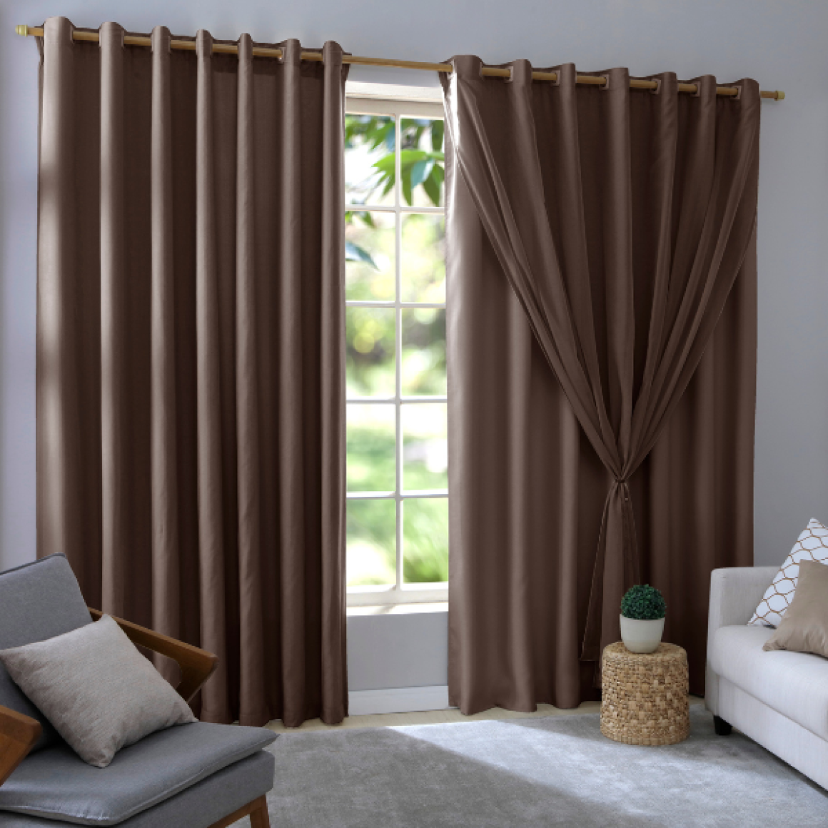 A cortina Bruna é confecionada em dois tecidos, sendo um deles o forro e o voal liso na parte de cima. Este modelo não reduz a luminosidade e bloqueia a visão do lado de fora.