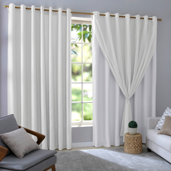 A cortina Bruna é confecionada em dois tecidos, sendo um deles o forro e o voal liso na parte de cima. Este modelo não reduz a luminosidade e bloqueia a visão do lado de fora.